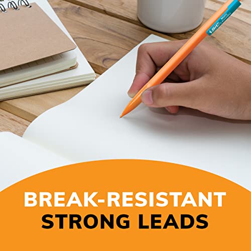 Details: Keep your writing precise and tidy by using BIC Xtra-Strong Number 2 Mechanical Pencils With Erasers. The 0.9mm break-resistant lead is thick and durable, making this pack of mechanical pencils a dependable choice for everyday writing activities. Each thick lead mechanical pencil in this set offers smooth, clear writing, and best of all ? no sharpening is required. Plus, the lead advances quickly with a simple click of the eraser, so you?re always ready to keep writing. For neat penmanship, these number two pencils ensure smudge-free writing that erases cleanly. A contrasting clip allows for easy attachment to notebooks, pockets and more, and the vibrantly colorful barrels showcase an on-trend design that livens up writing sessions to complete the fashionable look. Exceptional lead resilience and longevity make these refillable mechanical pencils a great option when taking standardized tests and restocking your school or office supplies. Choose the No. 1 selling mechanical pencil* by making the smart choice with BIC Xtra-Strong Mechanical Pencils. *Source: The NPD Group/ U.S. Retail Tracking Service/ Actual Unit Product Line Sales (Retail And Commercial Combined)/ Annual 2020).