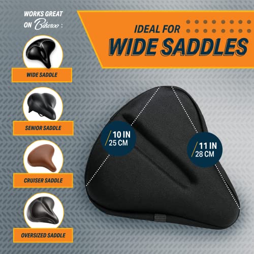 Bikeroo Bike Seat Cushion – Padded Gel Wide Adjustable Cover for Men & Womens Comfort, Compatible with Peloton, Stationary Exercise or Cruiser Bicycle Seats, 11in X 10in (Black)