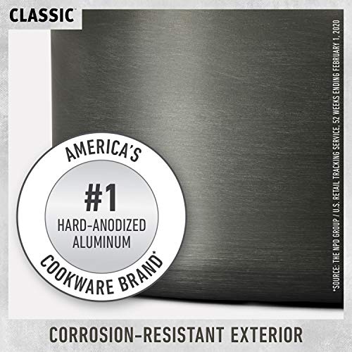 - Hard-anodized aluminum provides even heat distribution that’ll cook your food better and improve the taste