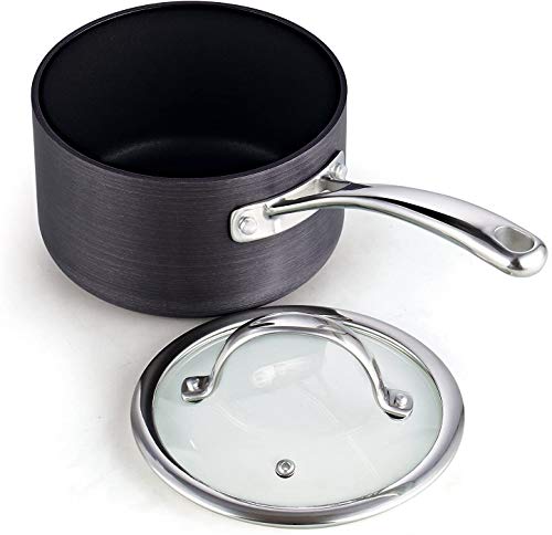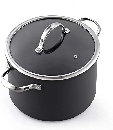 Details: The Cooks Standard 8-piece hard anodized nonstick cookware set, Black includes: 2 and 3 quart saucepans with lids, 8 quart stockpot with lid, and 8 and 10 inch saut?/fry pan. Cookware has a hard anodized surface that is durable, heats evenly/quickly, and prevents hot spots. Material is harder than steel, thick, and chip-resistant. Nonstick delivers exceptional performance, makes cleaning/food release easy, and allows for healthy cooking. Tempered glass lids with steam vent makes viewing food easy, keeps heat/moisture in, and fits on fry pans. Stainless steel handles stay cool/comfortable, are riveted for strength, and has a hole for hanging. Not induction compatible. Works on gas, electric, glass, ceramic, halogen, etc. Oven safe to 450 F, glass lid to 350F. Dishwasher safe, hand wash recommended.