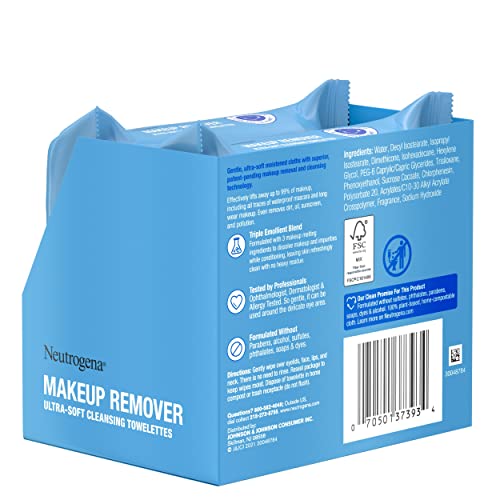 Details: Remove makeup in one easy step with Neutrogena Makeup Remover Face Wipes. These soft and gentle pre-moistened facial cleansing towelettes effectively dissolve all traces of dirt, oil and makeup–even waterproof mascara– for clean, fresh looking skin every day. Our makeup remover features an effective micellar-infused, triple emollient formula that leaves skin feeling refreshed, nourished, conditioned and thoroughly clean with no heavy residue. These facial towelettes also remove sweat, sunscreen, and pollution from skin with no need to rinse after use. These daily face wipes are formulated to be gentle on the sensitive eye area. The makeup removing wet wipes are formulated without phthalates, parabens, sulfates, alcohols, soaps, or dyes and are ophthalmologist-, dermatologist-, and allergy-tested. Designed with the earth in mind, the compostable wipes are made with 100% plant-based fibers and biodegrade in 35 days in home compost.