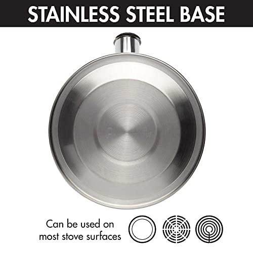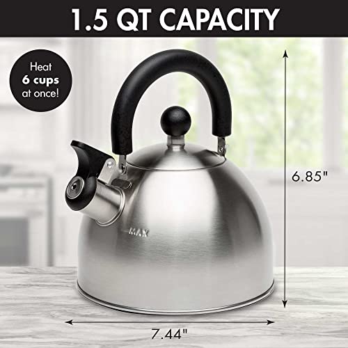 Primula Stewart Whistling Stovetop Tea Kettle Food Grade Stainless Steel, Hot Water Fast to Boil, Cool Touch Folding, 1.5 Qt, Brushed with Black Handle